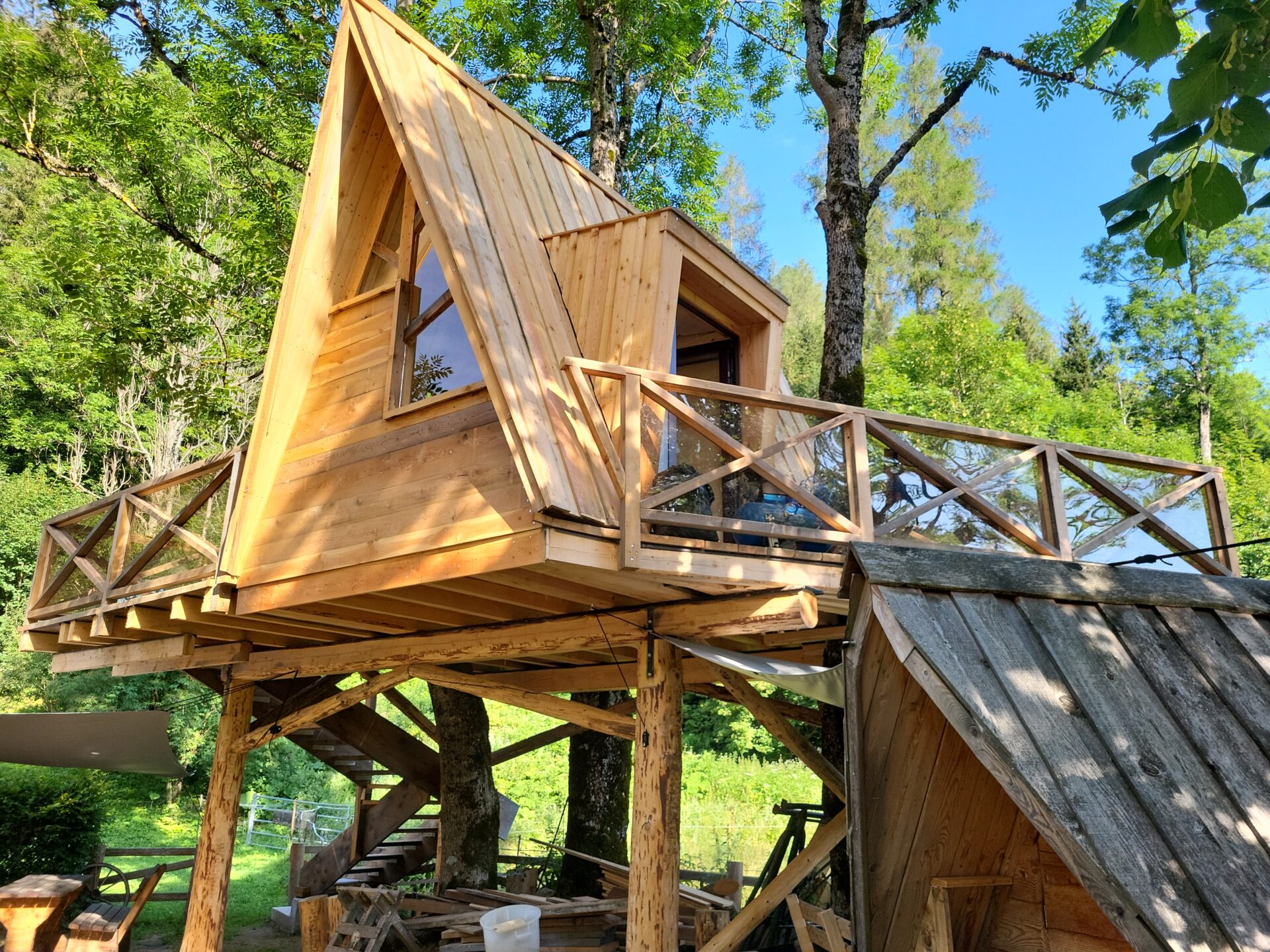 Slobodno zamijenite staklo drugim prozirnim materijalima, jer kućice na drvetu i drvene glamping kućice u obliku slova A savršeno nadopunjuju takve materijale.