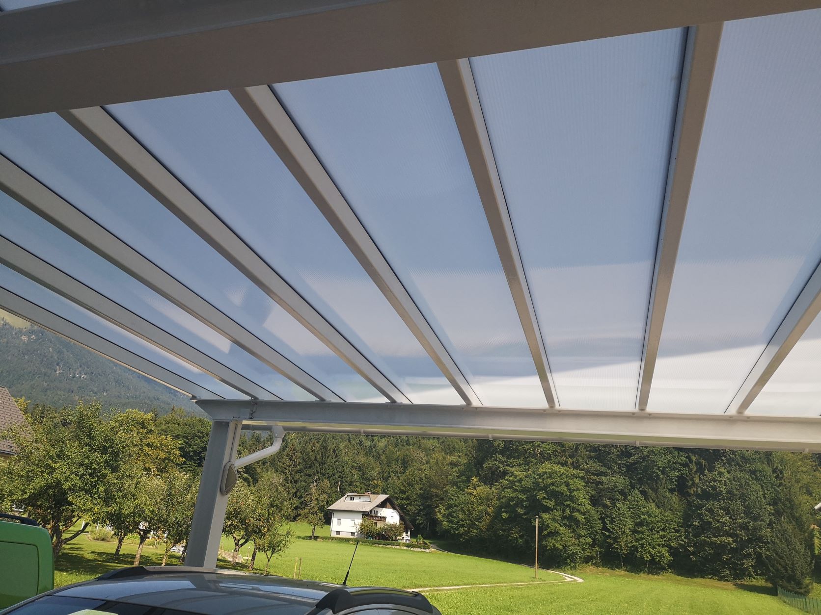 Prozorna večslojna polikarbonatna kritina z belimi diagonalnimi prekati. Ustvarja senc in odbija dobršen del sončnih žarkov.
